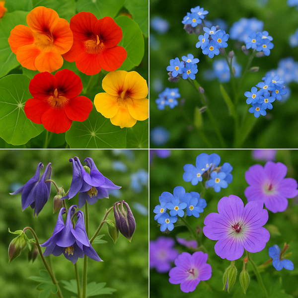 De soorten zijn Kattenstaart, Vergeet-me-nietjes, Digitalis 'Purple', Beemdooievaarsbek, Wilde Akelei, Oost Indische Kers, Damastbloem, Knikkend Nagelkruid, Lavatera en Cosmea.